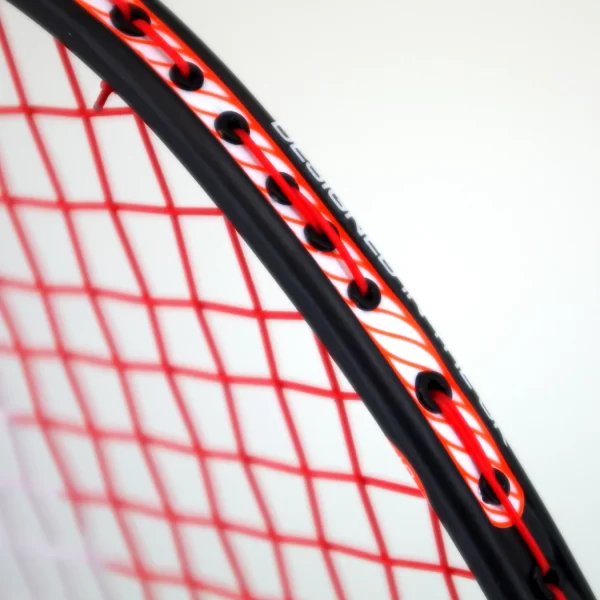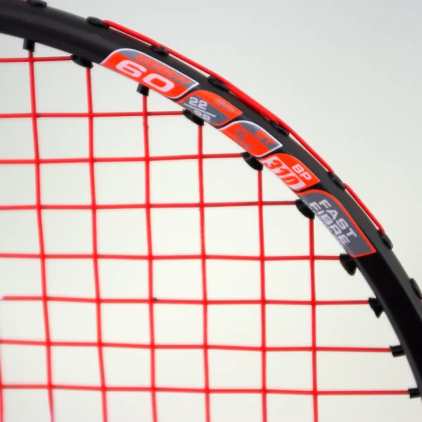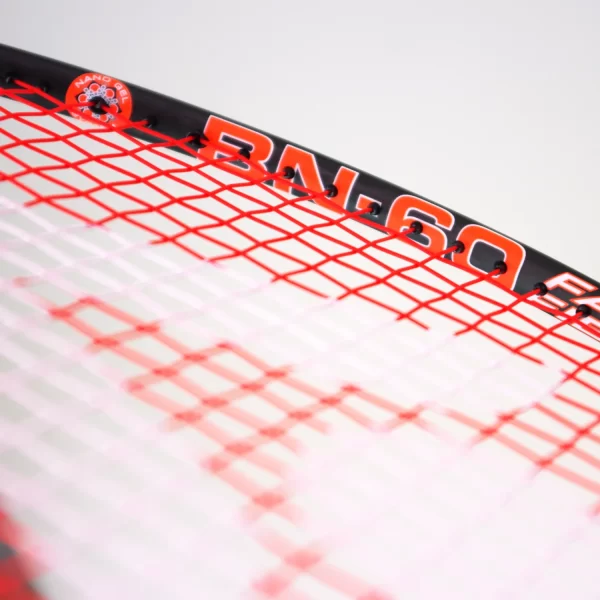 The BN60 is strung with Karakal Hot Zone in orange which contrasts nicely with the unpainted black graphite frame. This string offers power and performance for players looking for balanced and responsive play.