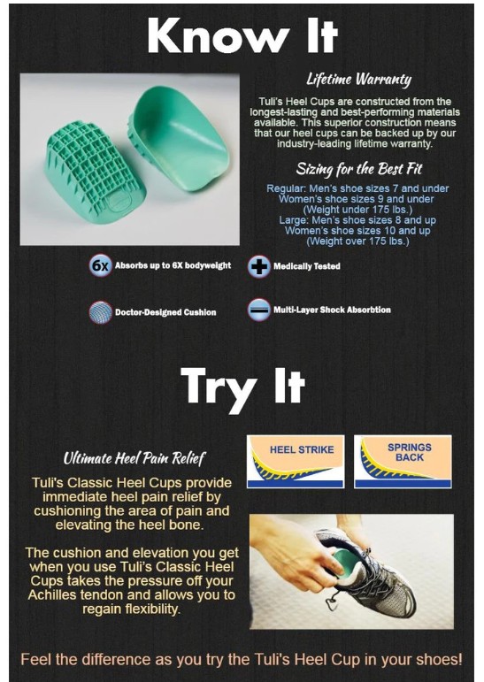 Plantar Fasciitis? Heel Pain? Tuli’s Heavy Duty® Heel Cups are the right heel cups for you!
